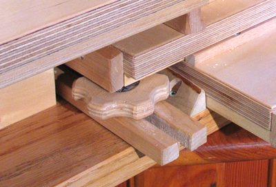 This is accomplished via a block screwed to the left side of the top most piece of plywood, which slides front to back. This block bumps against a stop which is fastened to the part of the sliding assembly that slides side to side.