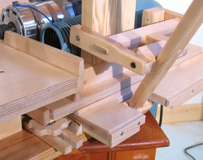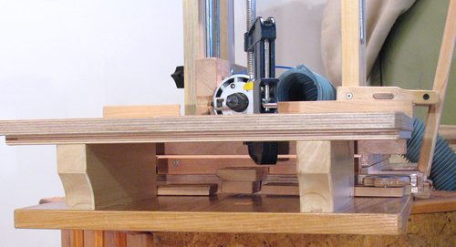 The control lever attaches to the router mounting assembly on the top layer of plywood. That way, the lever can be tilted side to side for the side motion, and front to back for the in/out motion of the router.