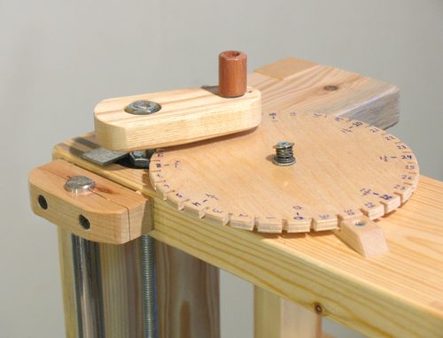 For many types of joints, I need to move the router up and down by a set number of turns for each joint. I found that I'm not that good at keeping track of how many turns I have put on the crank. So I added a "counter wheel" to count the number of turns. This wheel is advanced by a pin in the bottom of the crank, and is advanced by one notch for each turn, not unlike how a Geneva drive mechanism works. The difference is that the position of the intermittently turning wheel is not locked in between advances, whereas on a Geneva drive it is. So if the wheel is turned by half a notch when the pin is not engaged, it will jam on the next turn. To make this less likely, I made sure it turns with a fair bit of friction. There is a spring between the mounting screw and the wheel to press it down.