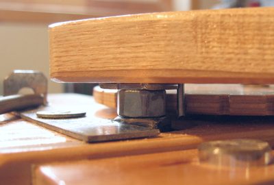 I found that due to vibration, the crank would slowly drift downward on its own, especially if I didn't tighten the vertical router position knob. So I added a "detent" mechanism that gives the crank six clicks per turn. It's just a spring loaded piece of metal that pushes against a nut on the shaft.
