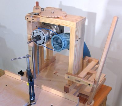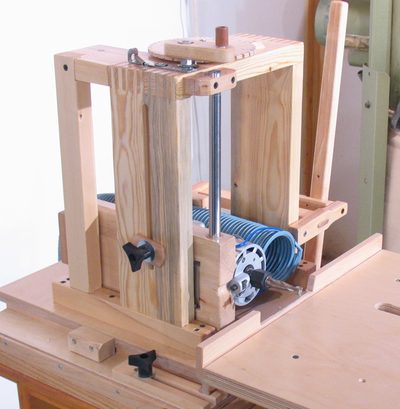 The router is moved up and down by turning a 3/8" threaded rod with a crank.