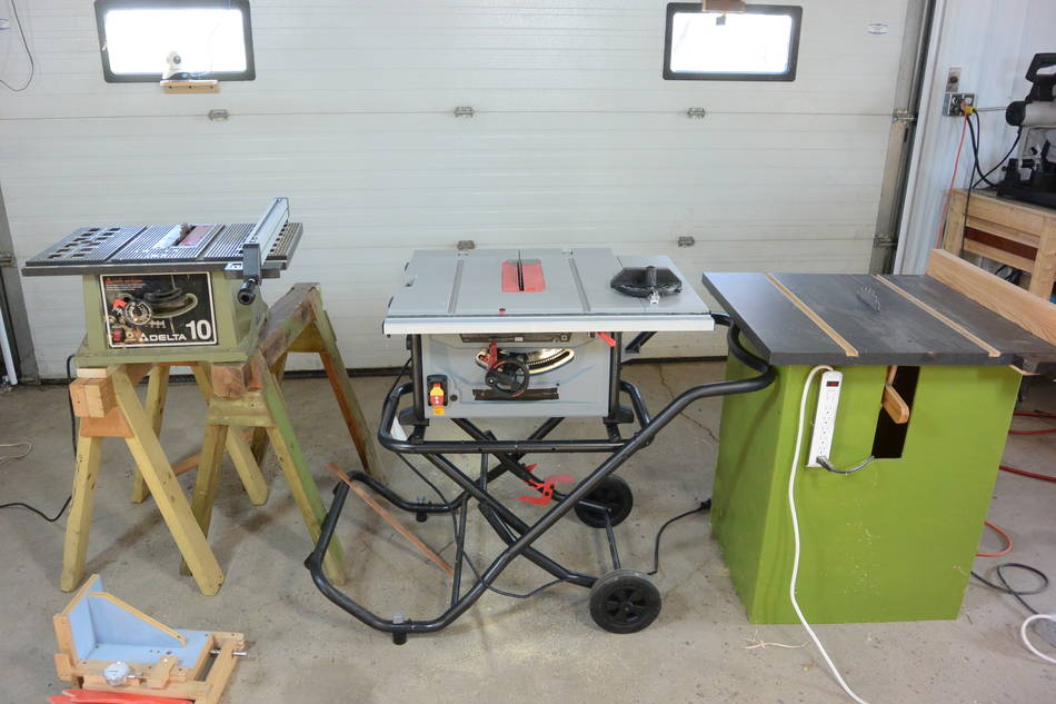 The other class of jobsite saw costs on the order of $400 Canadian. These usually have the internals made out of cast aluminium, with the saw motor raising and lowering along two steel rods. This type of saw is larger and more precise and robust than the really cheap jobsite saws. I used to think that this grade of jobsite saw would make a decent substitute for a hybrid table saw or old contractor saw, but the more I look at this type of saw, the less I think they are suitable for furniture making. At right in the picture at left is my homemade table saw. My homemade table saw is not as good as the $400 jobsite saws, but I think it's better than the really cheap ones.