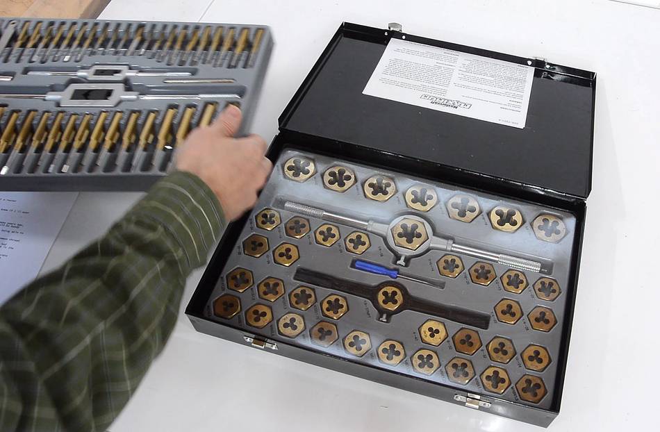 Breaking a tap in a tap and die set is not at all uncommon, and the instruction sheet contains some useful information on using them. Being just one page, it only contains the useful information. I wish more "instructions" were like this. For starting taps at a right angle, some people put the tap in a drill press chuck, then manually turn the chuck to start the thread in a piece of metal on the table.