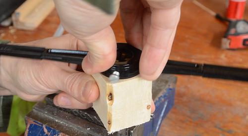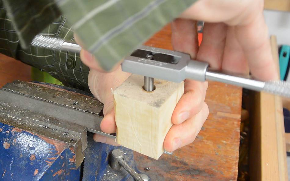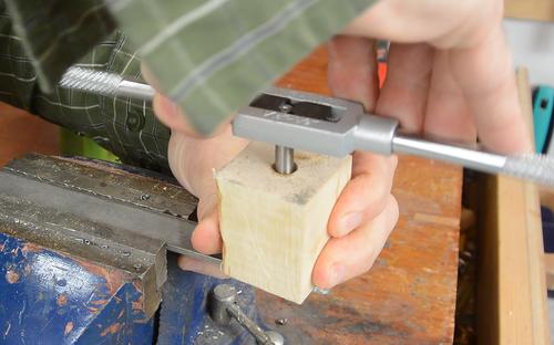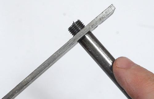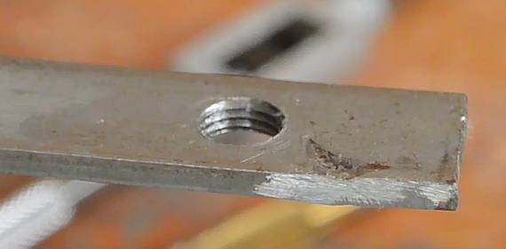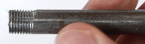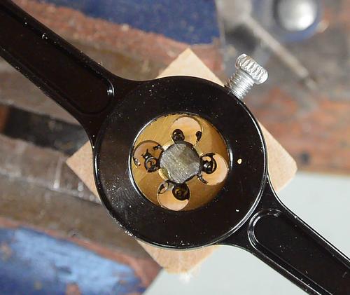My older tap and die set came with a die holder that had three prongs that you could adjust to line the die up with the shaft being cut, though it wasn't the most precisely formed, but it was useful to help get the die aligned straight when starting a thread. At right, you can see a thread I started with poor alignment. The thread just goes further off to the side the further I cut.