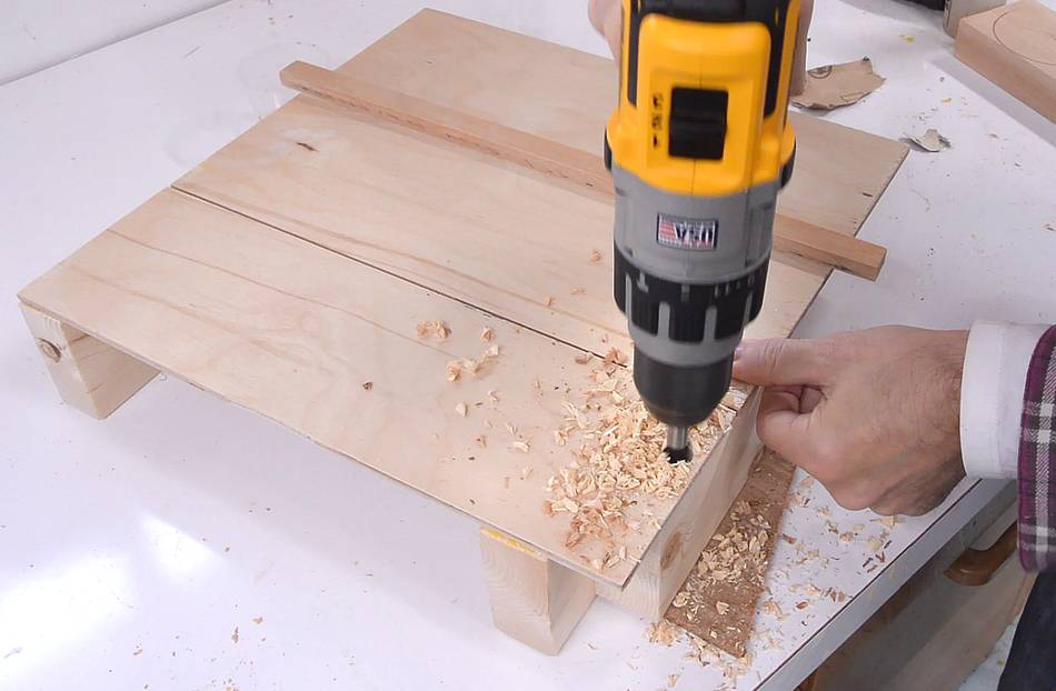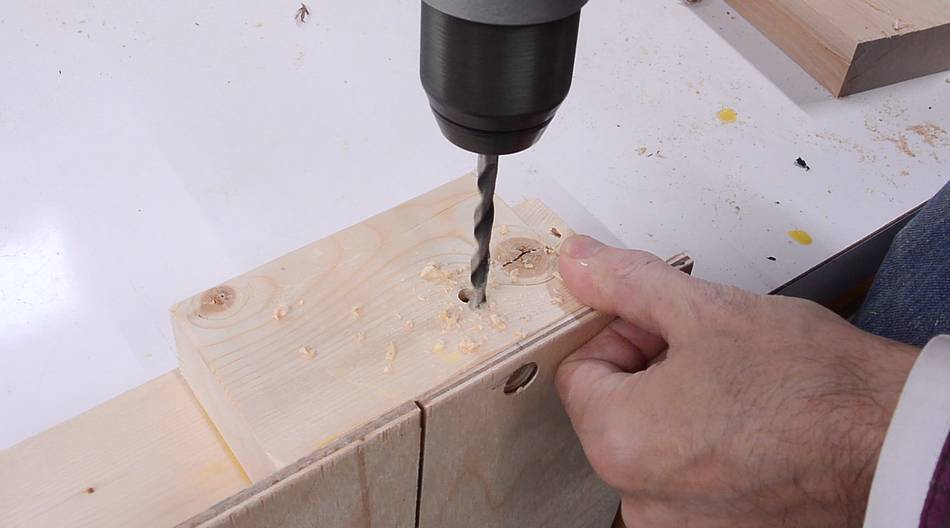 At left, I'm drilling a 9/16" hole for the dowel in the bottom of the sled.