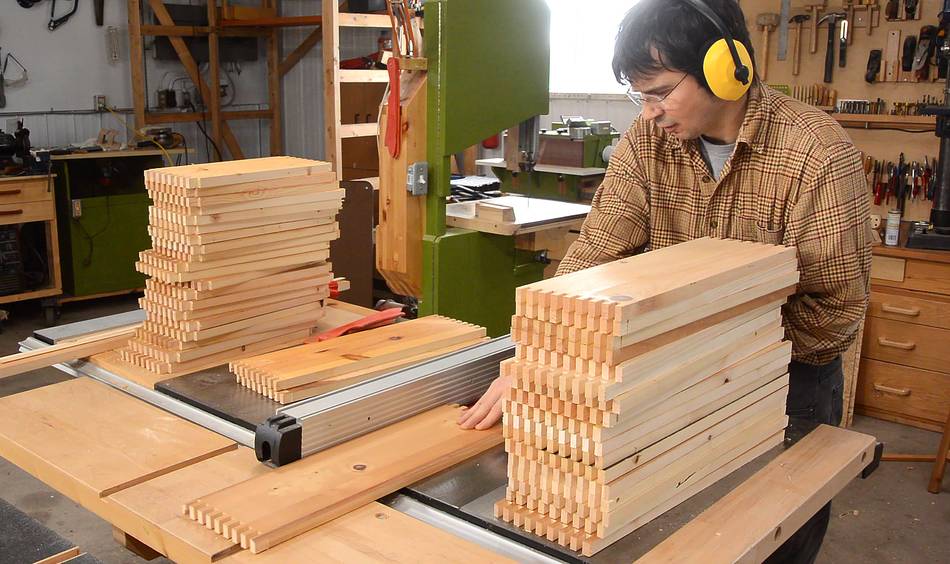 With 10 boxes, four sides to a box, two ends to each piece, and 8 or 9 notches for the joints, that makes for 680 notches (with 3/8" fingers). But loading five pieces into the jig at a time, cutting these didn't actually take very long.