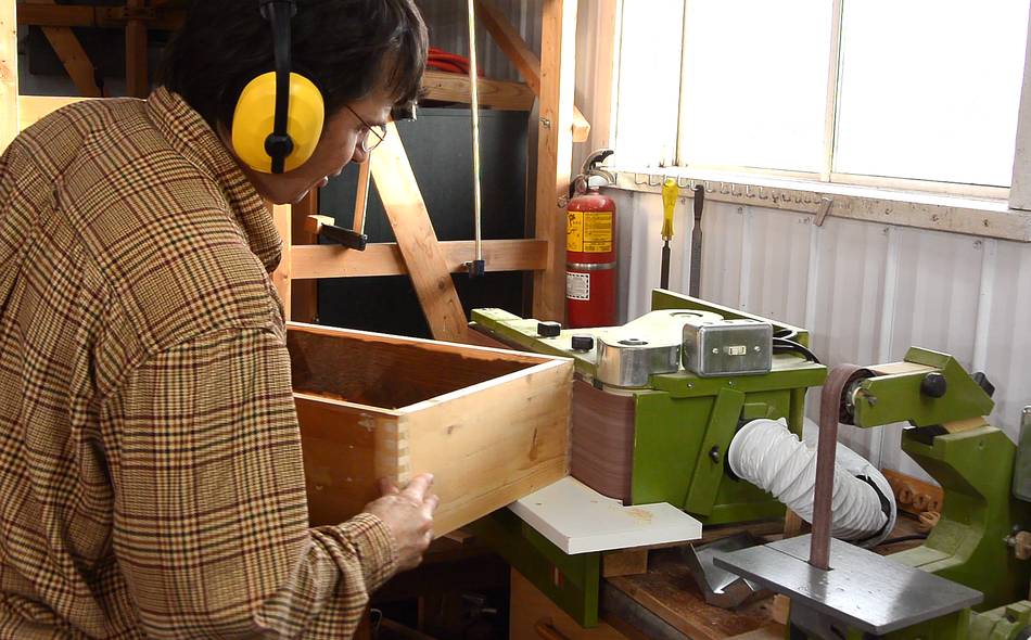 Sanding the edges of all the box pieces before assembling them.