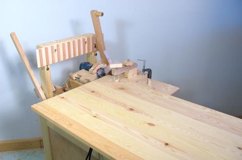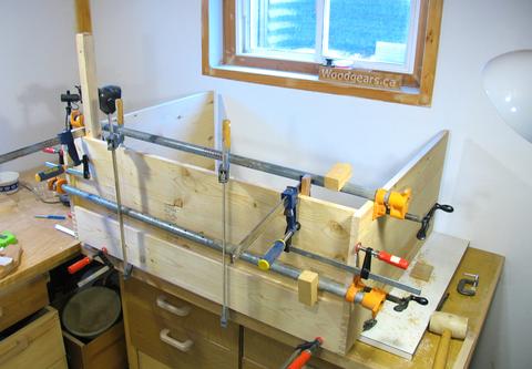 I made the bottom part of the front out of a solid 2x6 (cut down to about 13 x 3.5 cm) and finger jointed that to the sides. With the sides thinner than the bottom, I figured it would make sense to make the fingers for the sides wider than those of the bottom piece. I thought a while about how to make this joint. My screw advance box joint jig would be the logical choice, but the side panels were 40 cm wide, and my box joint jig can only take stock up to 31 cm. I could have cut the fingers with my slot mortiser. The turns counter on my vertical adjustment crank would have been good for spacing the cuts precisely. But clamping the panel upright to the machine would also have been awkward.