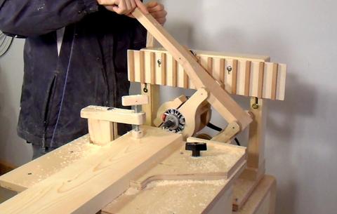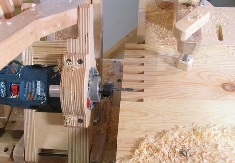 The slots in my template are about three millimeters wider than my guide bearing, seeing that I trimmed some material off both sides of the blocks. So the key was to always keep the bearing on one side of the slot. I unhooked one of my springs that help hold the router up, which unbalanced the mechanism and caused it to naturally press the guide bearing to one side of the slot.