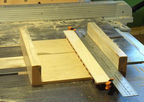 I did this by placing the template blocks-down on the table saw sled, with a ruler clamped to it in such a way that my cut positions would all be with the ruler's half inch increments aligned with an edge of the slot on the sled. I set the blade low so It would cut the block, but but not the plywood base.