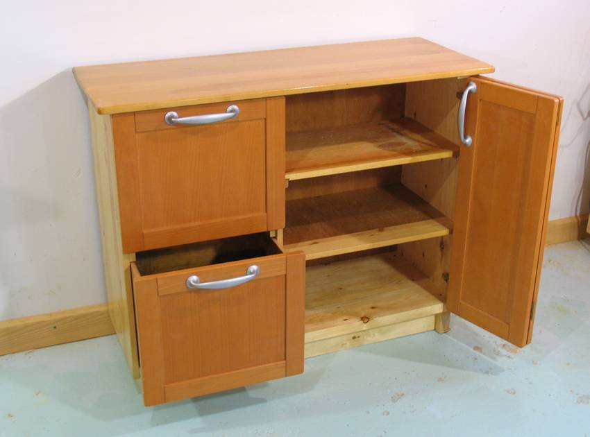 I had this spot near the stairs in my basement where I kept a simple shelving unit with junk on it, so I figured this would be a good spot to build a piece of furniture for. My friend Julia, who also helps out with the final editing of my articles, had an IKEA kitchen in her basement that she tore out. The kitchen had been put there by the previous owner, but it had never really been used. So when she tore it out, I got some of the doors and hinges. These doors were made of solid wood, unlike the cabinets, which were just particle board. I combined those used doors with some panels from IKEA shelving, and a hardwood slab that had been the top of a dresser to build this storage cabinet. The whole cabinet was built almost entirely out of used materials.