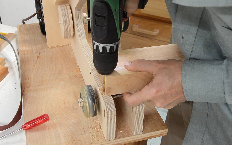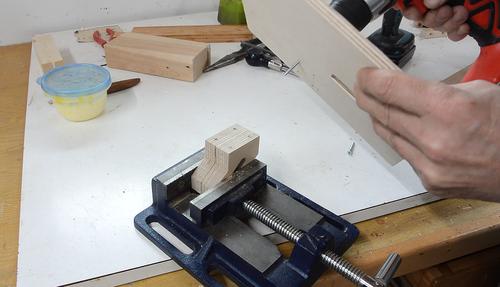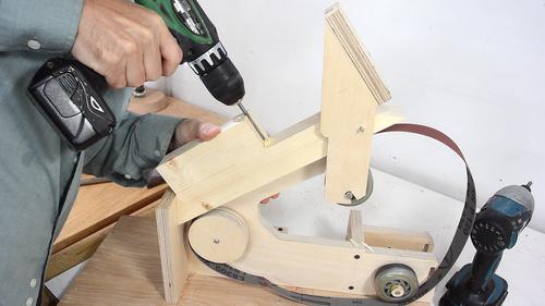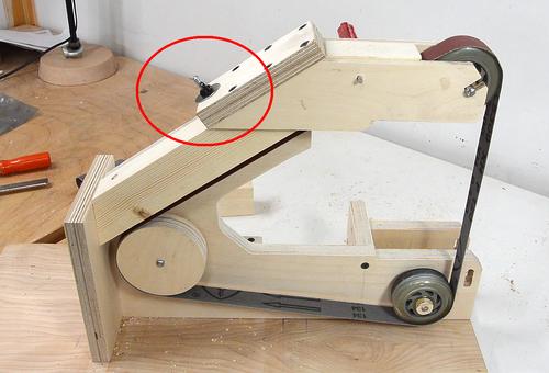 I'm using a block of wood with a V-notch cut in the end of it as a guide to make sure I get this hole square. That was easier than taking it apart again. Hopefully, you will have drilled this hole before assembling your sander.