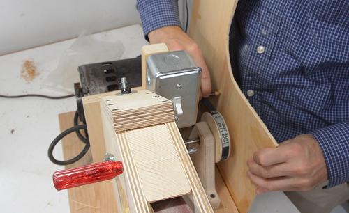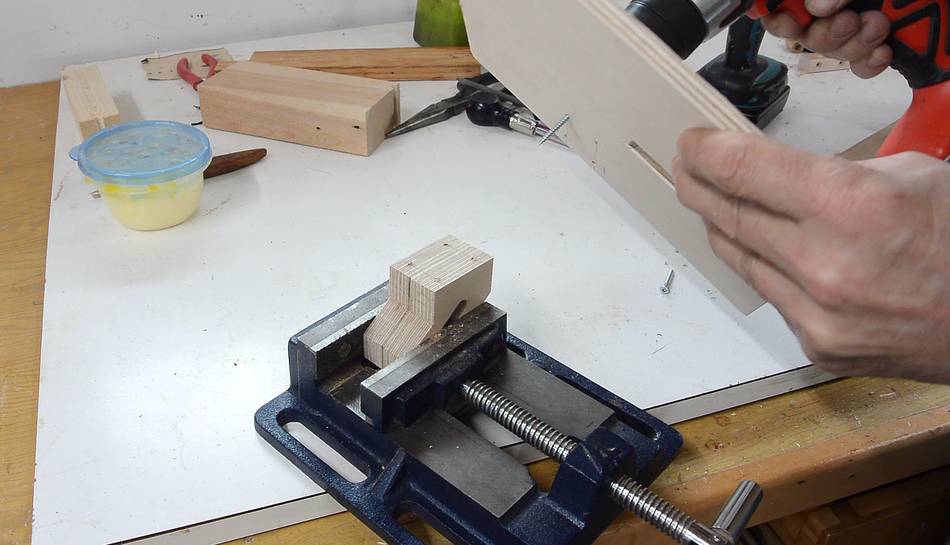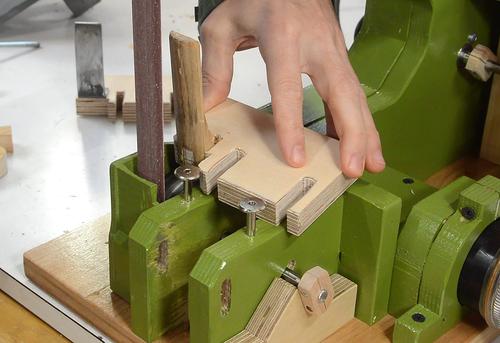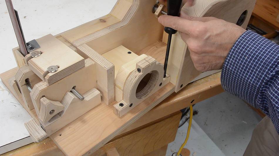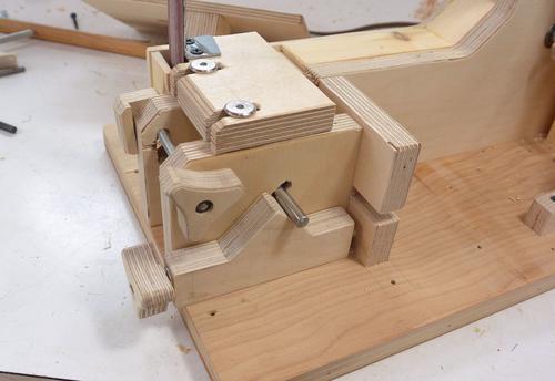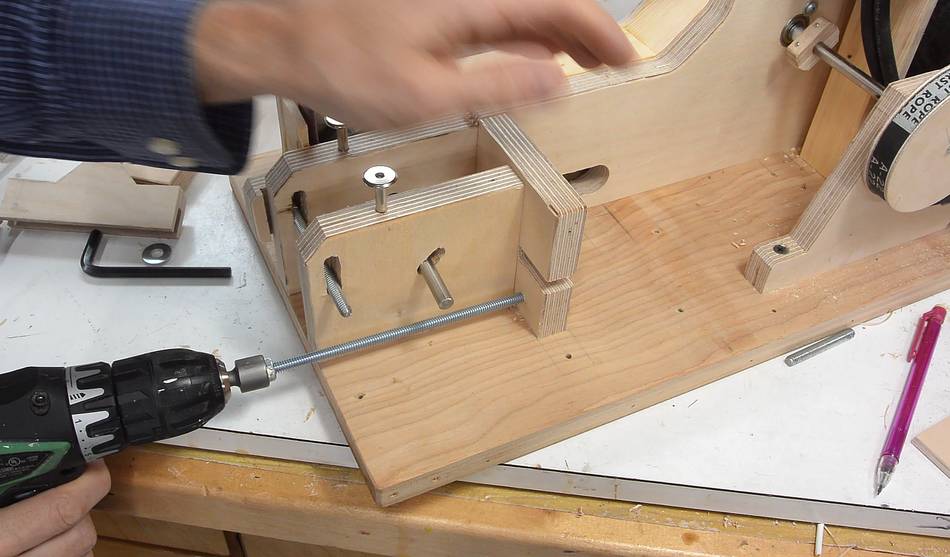A block of wood goes on the threaded rod and is pushed back by a knob on the front.