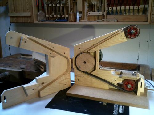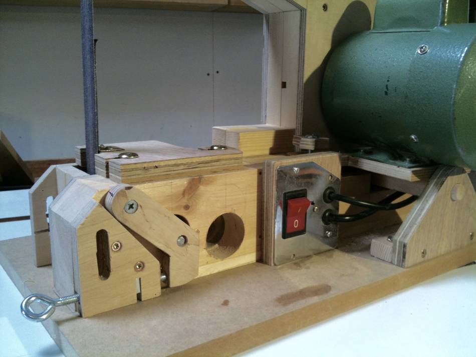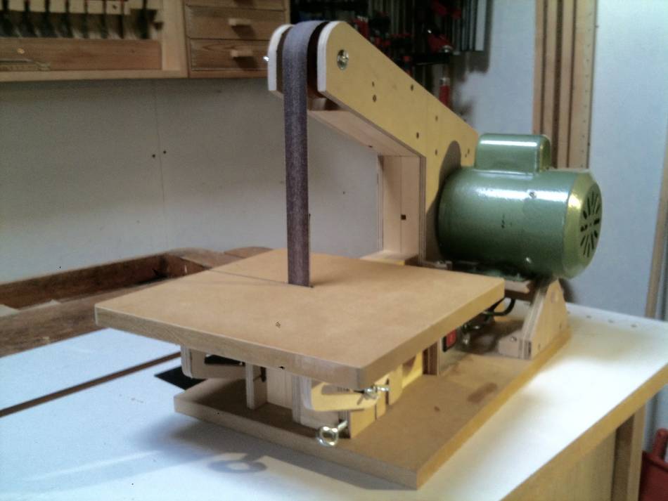 Jens Larsen's strip sanderJens larsen was inspired by my strip sander build to build a strip sander own design, using some of the ideas from my machine.Jens larsen writes: Hello Matthias Remember me? I’ve written you before about my home built bandsaw, blade grinding set-up and a few other things, and am now writing about the belt sander I just built. I got inspired to build on by your recent article. I happened to have some inline wheels and a motor from a small drill press I’d picked up for less than 10€ with the intention of converting it into an oscillating spindle sander. What I didn’t have was good quality plywood of the right thickness to simply copy yours, so I set about designing one around some scraps of 9 mm ply, 1x4” and 2x4” cut off’s, and a few other bits. Turned out all right I thought, and runs like a dream. I didn’t quite understand why you didn’t mount the driving wheel directly on the motor, so decided to do so, and to use the motor mount for tensioning the belt. I liked your belt alignment method, but couldn’t fit it neatly in my arrangement, so settled on a variant with a pivoted arm activated by a bolt and nut embedded in a distance piece slightly thicker than the arm. Not much else to add I think, except that the trick is, of course, to get the layout dead right from the start. I did this by first turning the wheels (and no, I didn’t have the guts to do so on the table saw, but used the lathe and disk sander), and checking the design with these and a belt, before proceeding with the actual construction. I had planned to keep the two halves of the body aligned by four dowels and keeping them together using bolts with wing nuts, but got lazy and ended up using four furniture screws that do both jobs instead. It means having to use a hex key when changing belts, but not much of a problem I thought. I hope you like it, and as I said all for 7.5 § for a motor with switch and all, a few pence for bolts, screws and glue, and scraps that would otherwise have ended in the bin. All the best Jens Larsen Matthias comments: I did, at length, consider putting the drive wheel directly on the motor shaft, but most of the motors I have available are open framed motors, with not very long shafts, and pulling in cooling air near the drive shaft. So I figured putting the motor behind the sander was the safer choice More projects by Jens Larsen: