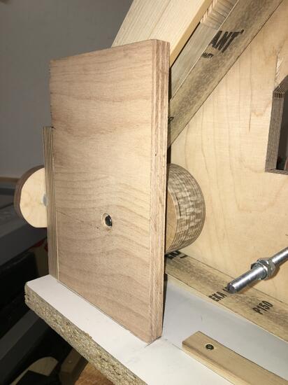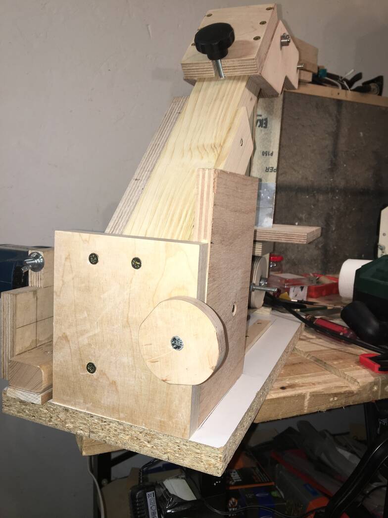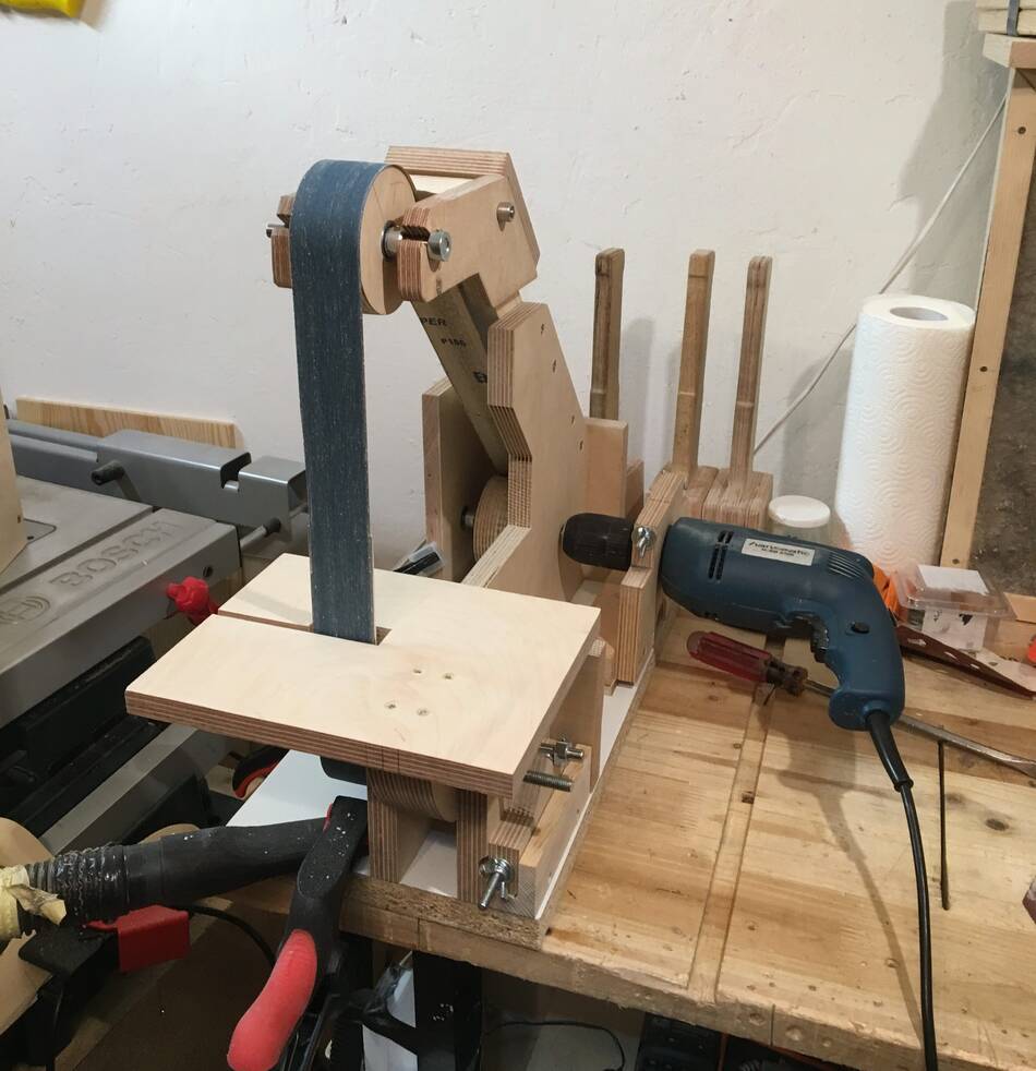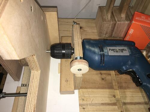 I had no motor available so I powered it with an electric hand drill. The mount is Baltic birch plywood with a 35 mm hold drilled through and a slit cut vertically down across the hole, but not all the way to the bottom of the mount. There is a 6mm threaded rod through the top of the mount to clamp the drill tight in place. The knob on the near end of the mount in the photo makes it quick, easy and toolless to mount and remove the drill, as it is often needed for drilling purposes. One advantage of using the drill for power is that I can adjust the speed of the sanding belt.