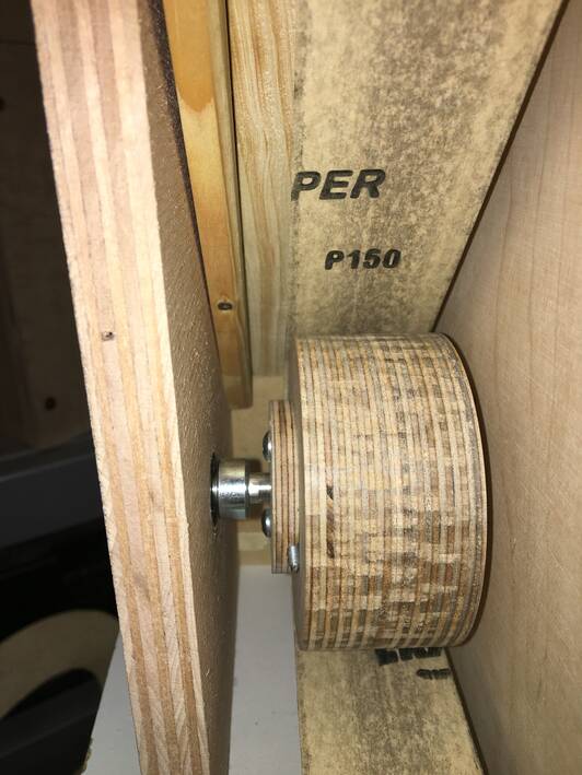 I considered the 2 bearings between the drill and the wheel instead, but I didn't want the drill taking up so much space to the side of the sander.