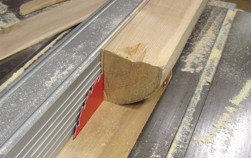 Because the sword is curved, I couldn't just do a regular rip cut to cut a bevel on the sides. Instead, I used more of a cove cutting technique. I passed the sword sideways over the blade, each time raising the blade by about a millimeter. I attached a stop, which is held into the T-slot to help guide the sword and keep it from getting pulled into the saw blade. I cut it on the back side of the saw blade, which pulled the blade against my stop. In retrospect, a safer thing would have been to pass the sword on the front side of the saw blade, which would have pushed the sword away from the blade.