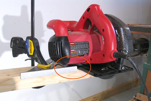 To make the cut, press the shoe of the circular saw up against the square. You will have to