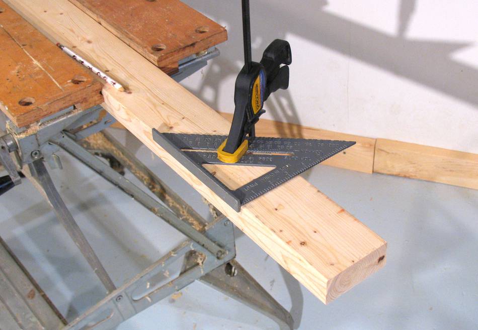 A rafter square, clamped to the 2x4 works quite well as a guide for the circular saw. I like using a rafter square because they are small, sturdy, accurate, and inexpensive. They are called rafter squares because they can be used to mark angles for cutting off rafters at an angle.
