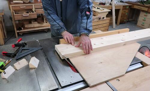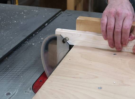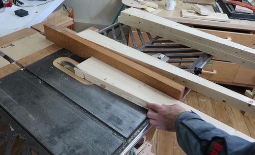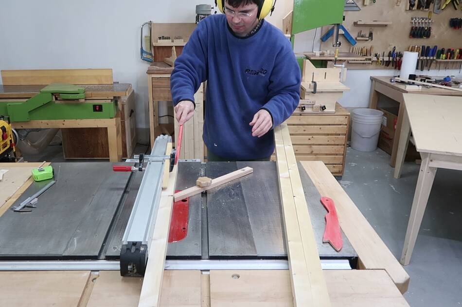 Cutting miters on the ends of the apron rails. I firmly hold the wood down,