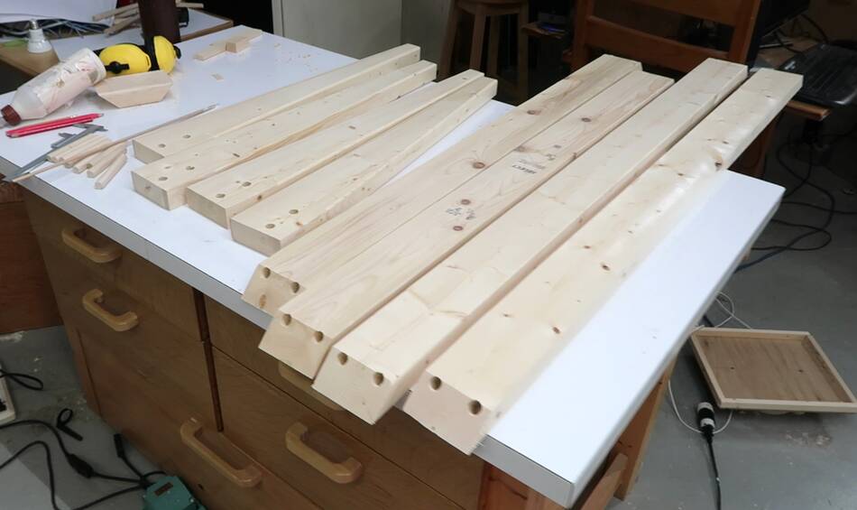 Apron rails, legs and dowels all ready for glue-up.