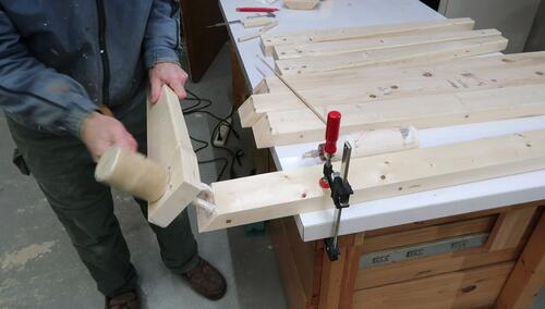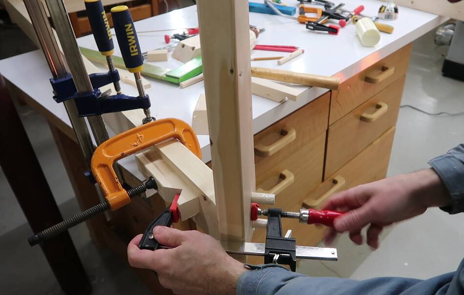 Using some clamping cauls to clamp the apron rails to the leg.