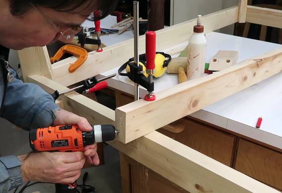 These are just screwed into the apron rails using some screws at an angle. I should add that I hate stuff made with pocket hole joinery, but if I just put a screw in at an angle (drilling the pilot holes, at right), without a pocket hole, then it's not a pocket hole :)