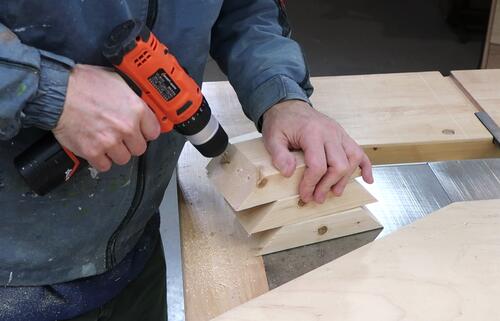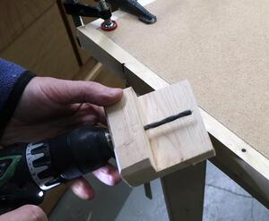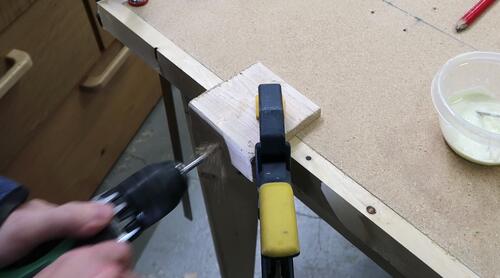 I made some gussets to put into the corners of the table. Here drilling pilot
