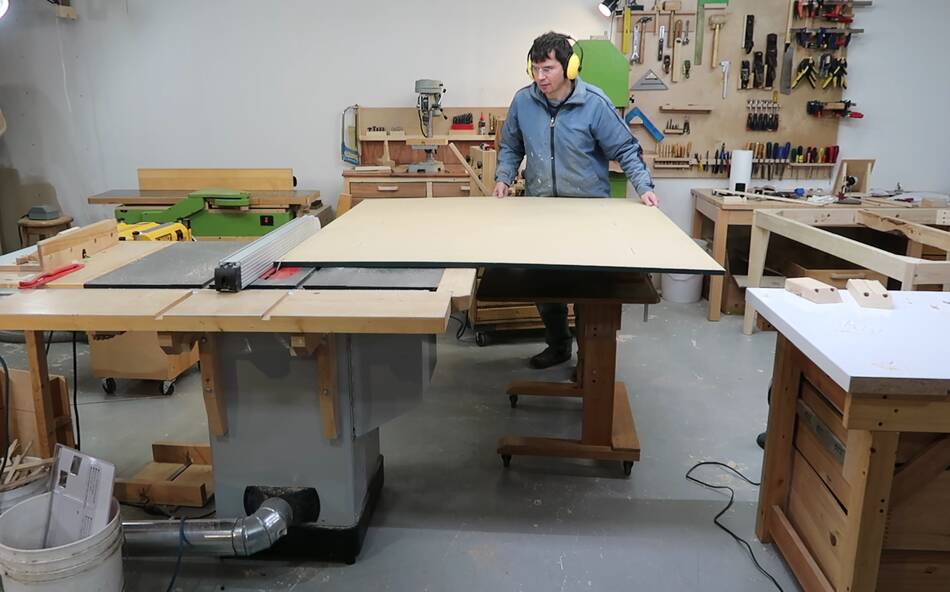 adjust the wheely desk to the height of the table saw, clamped the particle board