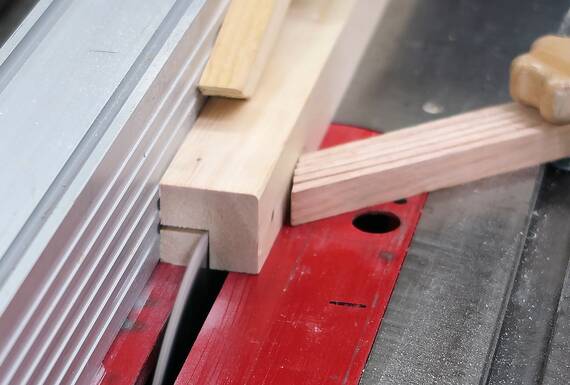 I wanted to join the legs with 45° miter joints, so I had to set the saw
