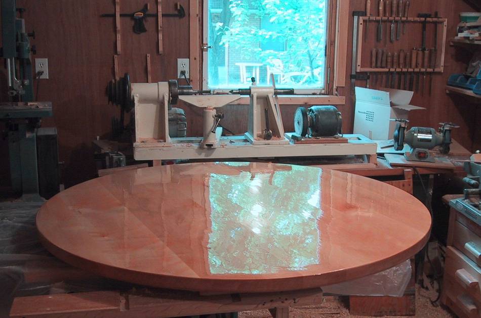 I like to put a nice and thick final coat on the top of the table. The manufacturer's instructions say to use thin coats. Probably because if you put too much on, it tends to run. But with a horizontal table top, this is not much of an issue.