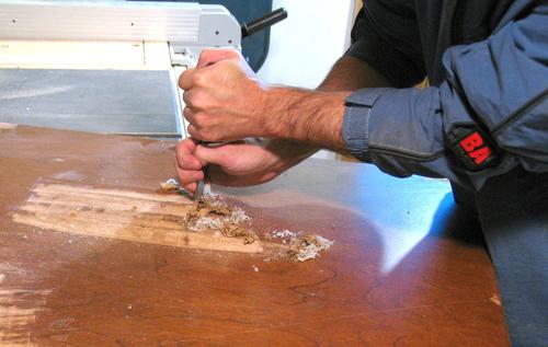 I started by scraping the varnish off with a 1.25" wide chisel. This takes lots of force and elbow grease. I'm holding the chisel vertically against the surface, and pushing down hard on it as I drag it across. The chisel needs to be quite sharp for it to take off the varnish, and it dulls quickly. It's good for a patch about twice the size I'm doing in the photo before it needs a light resharpening to continue.