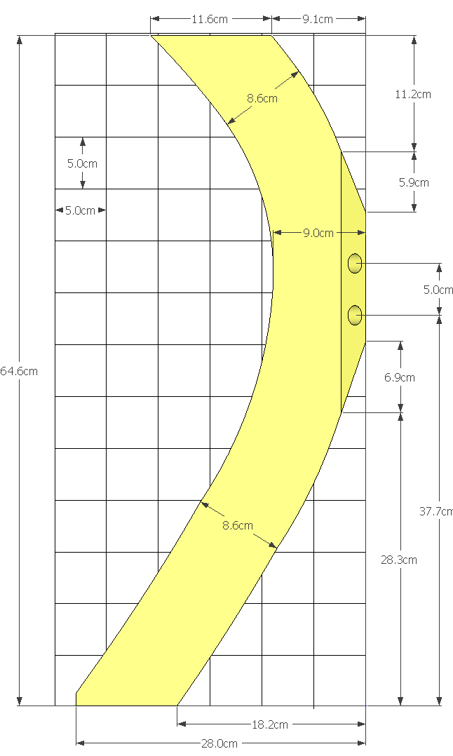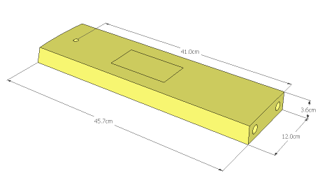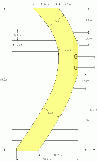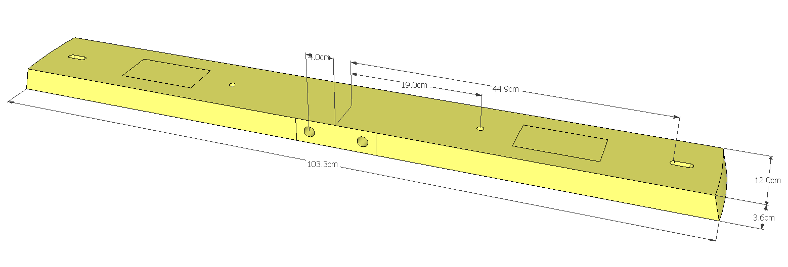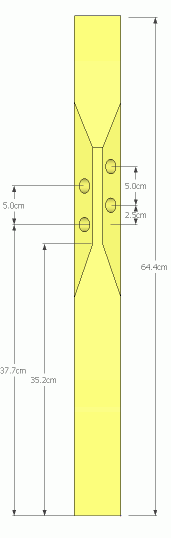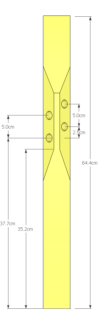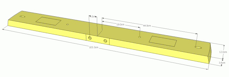 Table supports![]() The long table support is mounted perpendicular to the grain of the table top. The holes are 5/8" in diameter, and 2.5 cm deep. The ends are beveled 22 degrees, and cut as an arc, with the center of the board as the middle of the table. The rectangles mark where the legs attach. These aren't dimensioned. Make sure the cross is centered on the legs before screwing it down. The short table supports are doweled into the long table support to form a cross. The holes in the end are 5/8" in diameter, and drilled 5 cm deep The table supports are assembled into a cross, and then attached to the top of the legs with screws from above. The position of the screws is not shown. The bolt holes through the table supports are for bolts to attach the table top with. The holes near the end are elongated to allow some expansion and contraction of the table top if the table top is made of solid wood. For plywood or particle board table tops, this is not necessary. DowelsYou will need 16 pieces of 3/4" dowel just shorter than 10 cm, and 4 pieces of 5/8" dowel just shorter than 7.5 cm.Table topThe table top should be 120 cm in diameter, and 3.6 cm thick.See also: Building this table