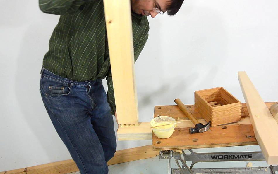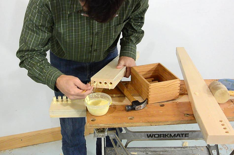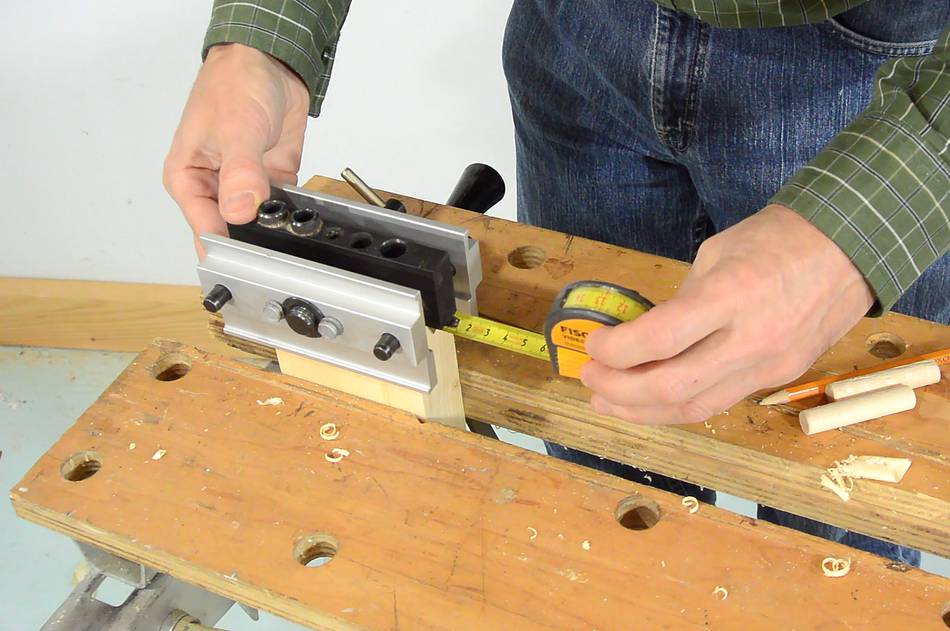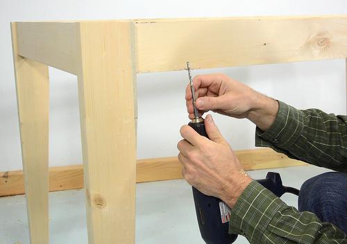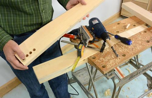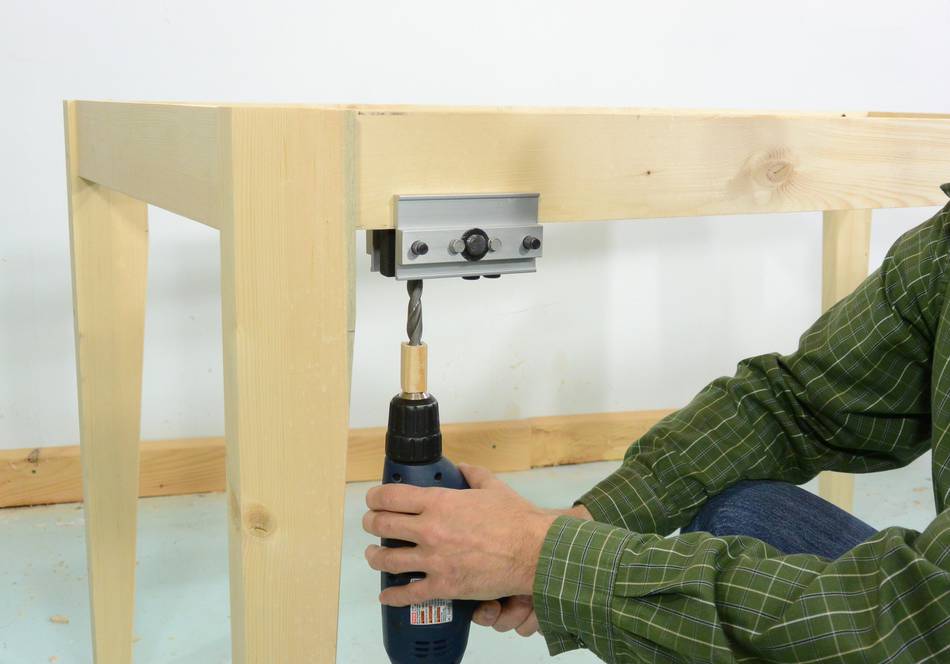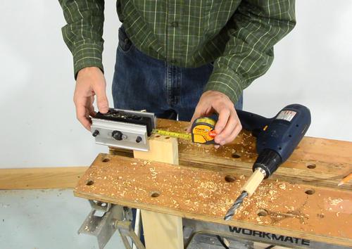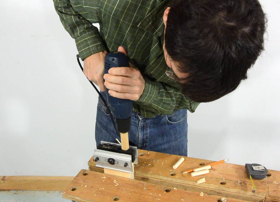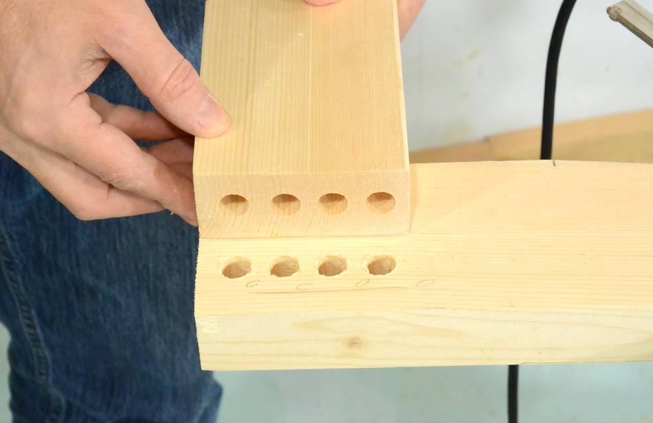 I'm going to join the legs with four dowels. Alignment of the holes on
