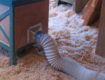 More as an experiment than anything else, I decided to try connecting the saw to the fixed end of the sheet metal duct pipe with a cheap piece of dryer hose, just to see how long it would last. If it would last a year, I figured I could just keep replacing it. Certainly, its very flexible, which is handy when moving the saw around a little bit. Well, more than 10 years later, I'm still using that original piece of cheap dryer hose, so I guess it held up much better than I'd imagined. I don't run the dust extraction system every time I use my table saw. Even with just the enclosure on the bottom of the saw, it cuts down on flying dust tremendously. With the dust extraction system being relatively powerful, sometimes I just run it while doing work on the lathe or with a router. It has enough volume that it will circulate roughly all the air from the workshop through the dust extractor every 15 minutes, so running it, even near the source of dust, tends to clear the air of fine dust over time. Very handy that way! You may wonder about all the planer shavings on the floor. I spread these around intentionally. Initially as makeshift floor insulation in the winter, but then I realized the padding they provide really helped in terms of foot comfort while working in the shop. When the shavings got too full of other types of dirt, I sweep them up and throw them out, and then spread fresh shavings on the floor right away. Keeping shavings on the floor is only practical in a detached shop, where tracking the dust through the house is not an issue. In my basement workshop, I always sweep up the shavings. Also see my homemade dust collector