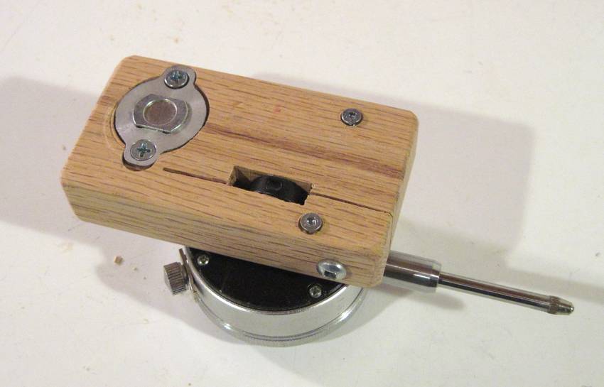 I used a magnetic door catch in a block of wood to hold the dial indicator. Lee Valley Tools