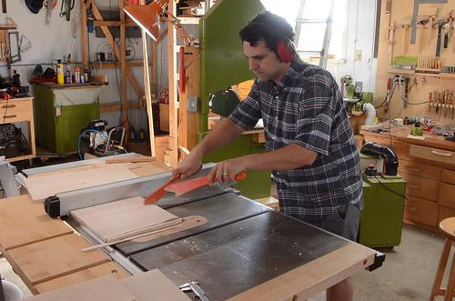 But being wary of the blade, he's pushing the wood too