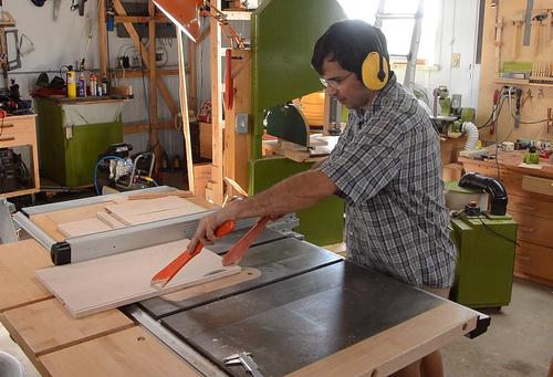 John Heisz doesn't like this style of push sticks and is more an advocate of using bare hands for this type of cut. (see his video). I have to say, seeing how Paul cut the panel, he would have been better off using his hands. Though with a smaller panel, and if for some reason kickback were to occur without pushsticks, the risk of getting fingers caught in the blade would be much higher