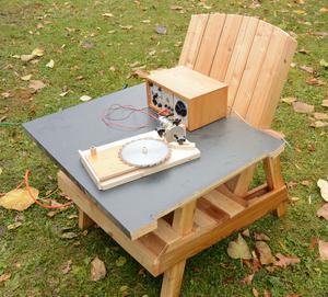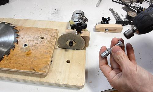 I also added a threaded insert near the cutting disk. To install it, I put the insert on the end of a 5/16" bolt, jammed with a nut, then used a drill with nut driver attachment to drive that into the wood. I then backed out the bolt, with the insert staying in the wood.