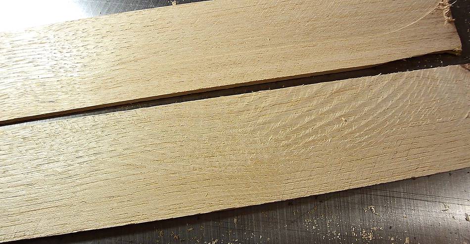 I then did another test, pushing the wood through at a more moderate rate. The upper piece of wood at left is from that cut. That blade was never a particularly good blade, and it was incredibly dull before I sharpened it, so I'm satisfied with the results. But for my fine cutting blades, I'll probably get them professionally sharpened every other time.