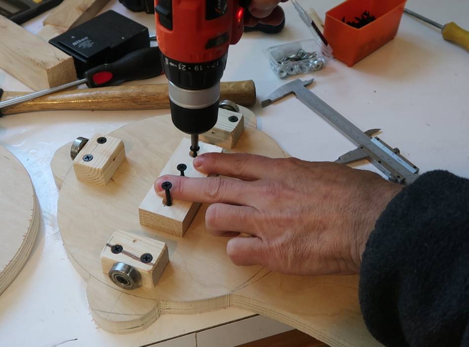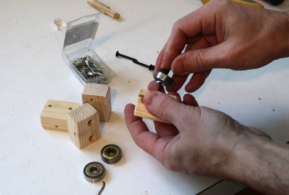 The bearings are screwed to the sides of small wooden blocks. The head of a drywall screw is just barely big enough to hold the bearing, and with a washer behind the bearing, it can spin freely without rubbing against the block.