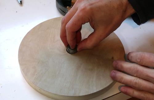 the hole positions by tapping a piece of plywood onto the screw studs sticking