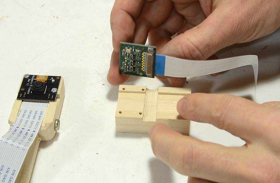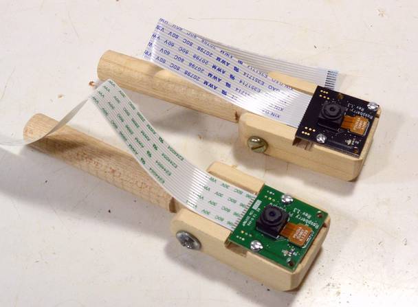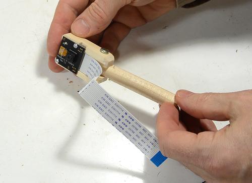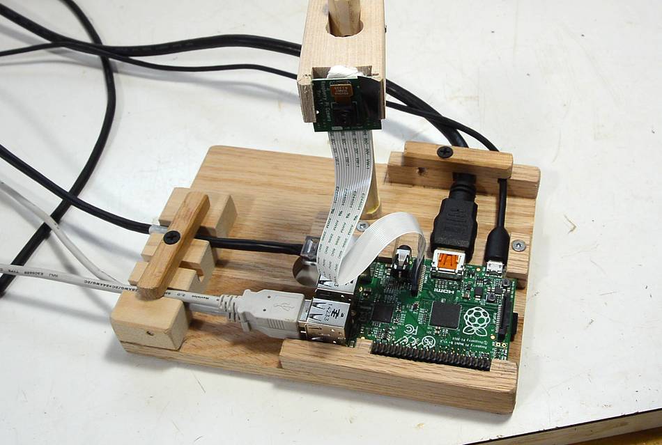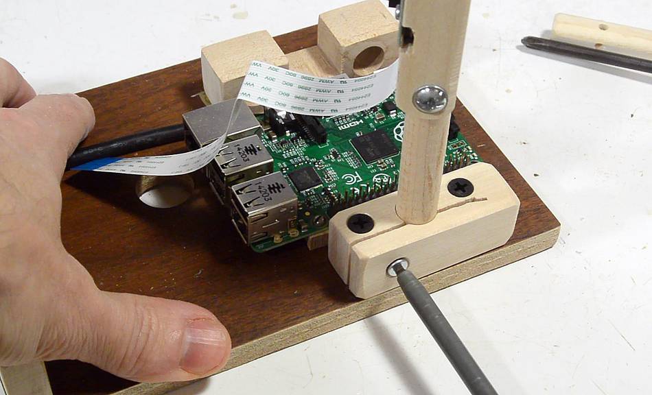 A clamp, tightened with a wood screw, holds the post for the Pi's camera. This