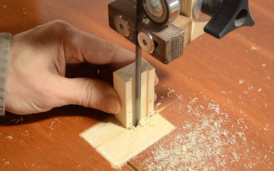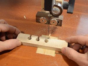 This started as a block of wood. I drilled pilot holes for the screws, then cut a notch along the length, and one across it on the bandsaw.