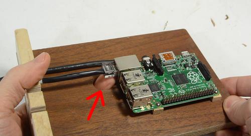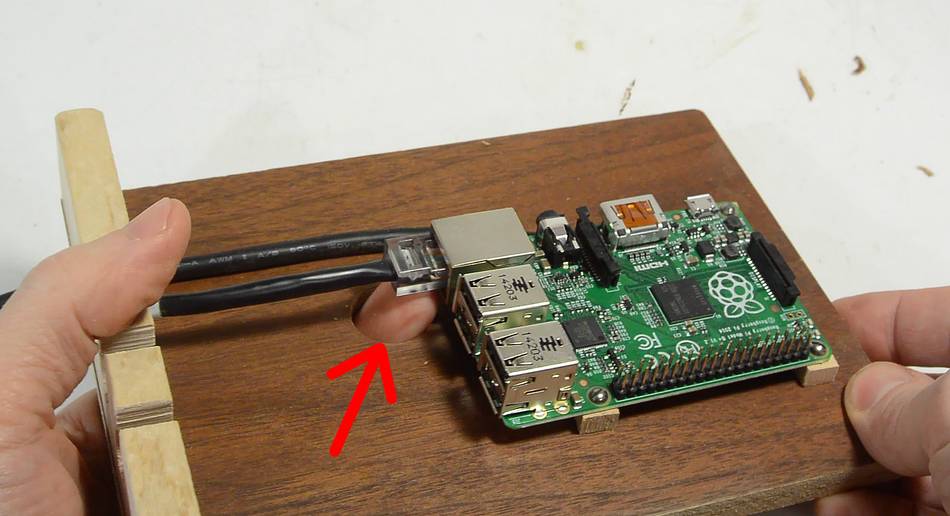 A hole in the plywood base makes it easier to push the tab on the Ethernet
