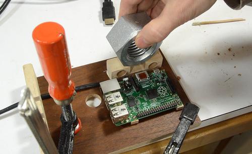 I start with a scrap of plywood, and punch some holes through the Raspberry Pi's