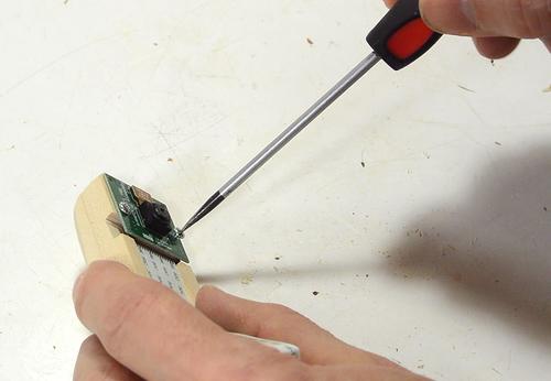 Finally, screwing on the camera module, with some very tiny machine screws. As with the