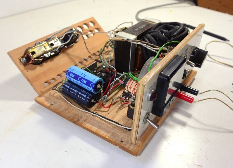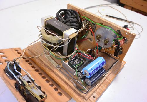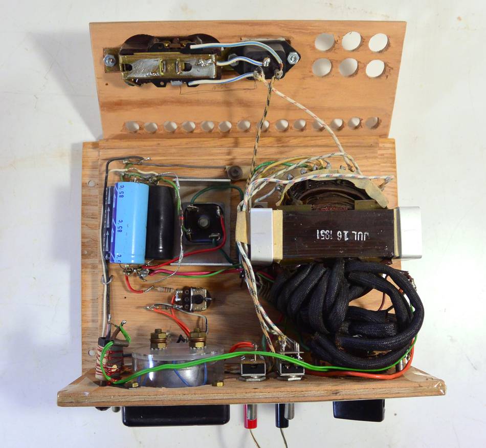 At the heart is a filament transformer from an old tube tester from 1951. The heating filaments of tubes in the cheaper transformer-less TVs were all wired in series, so they used to come with all kinds of filament voltages. The tube tester had a many-tapped transformer for selecting a wide range of voltages.