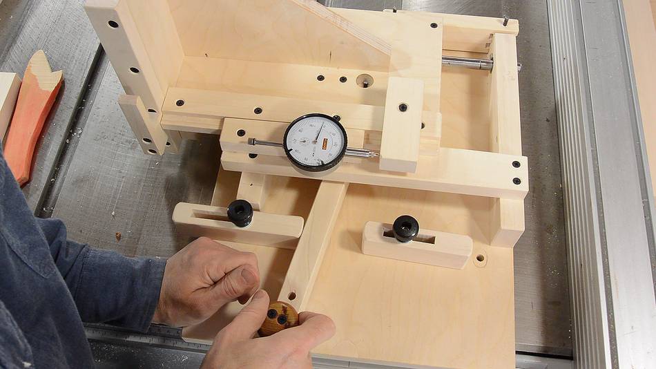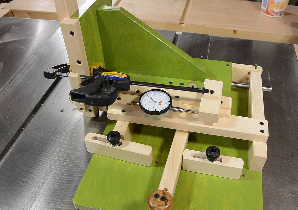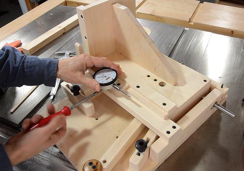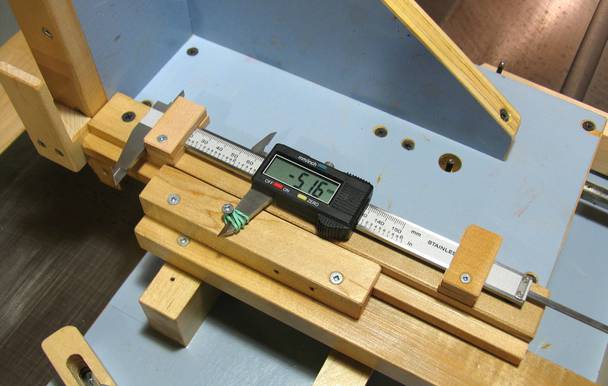 You can use a caliper attached to the sled, as shown at right. A dial caliper would be better, but a dial indicator is better still.
