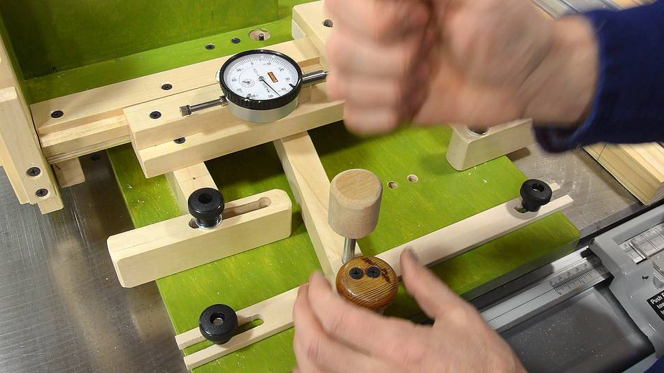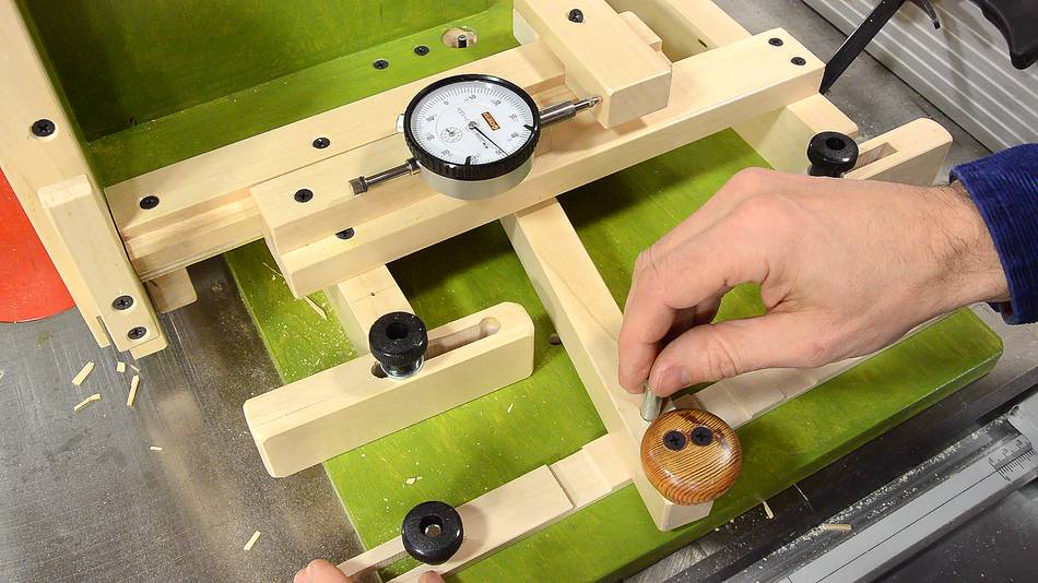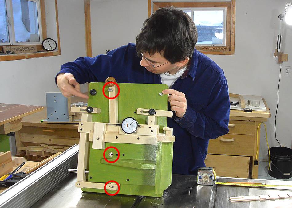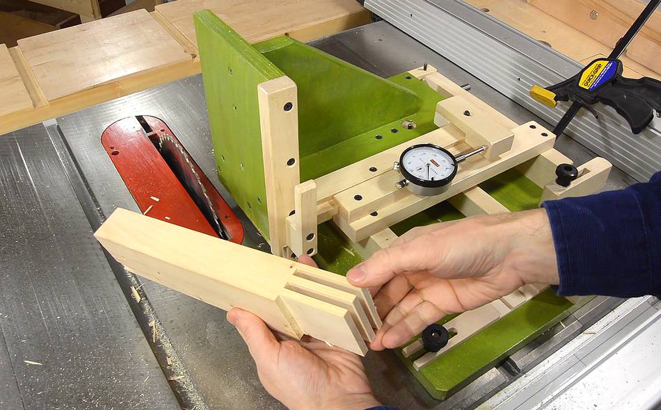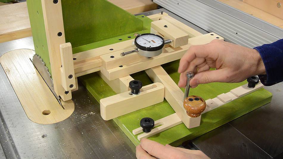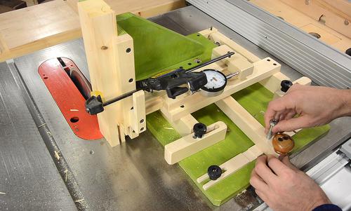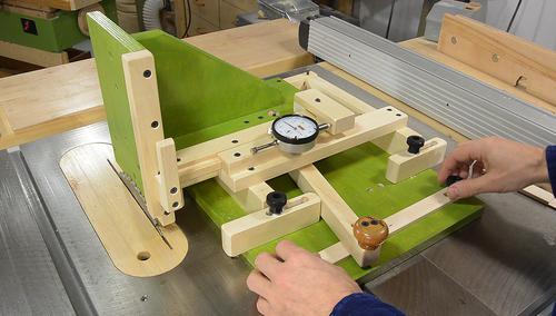 The set-up begins with the face of the jig against the saw blade, and the dial indicator adjusted so that it reads zero.